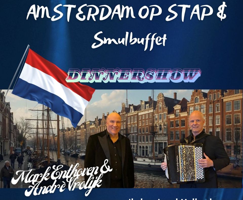 Zanger Mark Enthoven en accordeon virtuoos André Vrolijk nemen u mee tijdens een gezellige Hollandse avond vol met bekende meezingers en klassiekers van eigen bodem, en verrassende uitstapjes over de grens, genietend in een sfeervolle ambiance aan de haven en heerlijk eten.