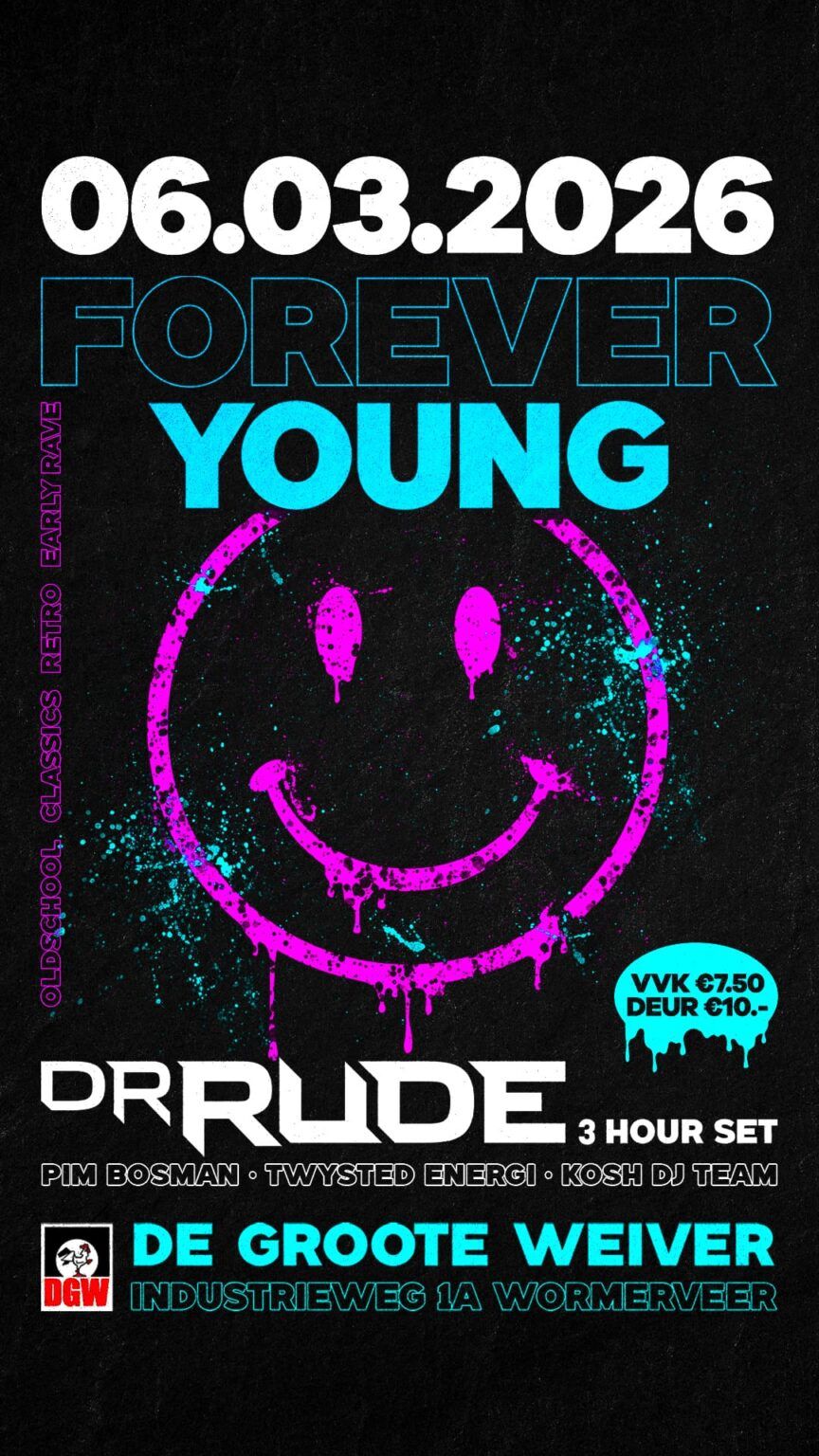 6 Maart is het weer tijd voor een nieuwe editie van Forever Young! Dit keer een Dr.Rude 3 Uurs solo, met Support van Pim Bosman, Twysted Energi & Kosh DJ Team! Verwacht de beste oldschool klappers, Retro, Jumpclassics, Early Rave en meer!
