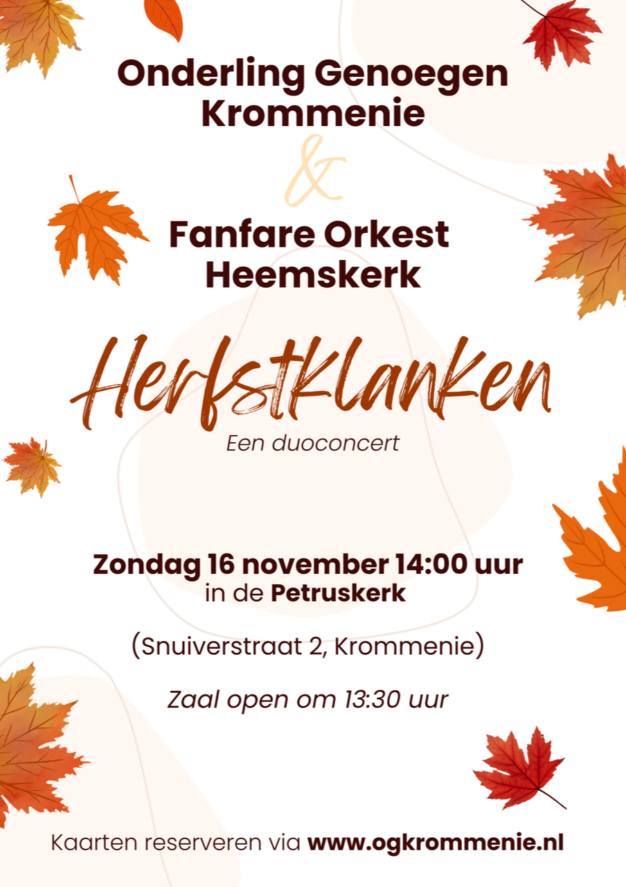 Op zondag 16 november bundelen Onderling Genoegen Krommenie en Fanfare Orkest Heemskerk hun muzikale krachten in een gezamenlijk najaarsconcert met de titel Herfstklanken. Het duoconcert vindt plaats in de Petruskerk in Krommenie en begint om 14:00 uur. De kerkdeuren openen om 13:30 uur. Bbeide orkesten brengen een gevarieerd en sfeervol programma, in het teken van de herfst.