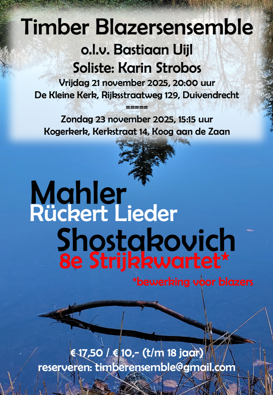Op zondagmiddag 23 november speelt Timber Blazersensemble in de Kogerkerk in Koog aan de Zaan. Op het programma staan onder meer de ontroerende Rückert Lieder van Gustav Mahler, met medewerking van mezzosopraan Karin Strobos, en het indrukwekkende 8e Strijkkwartet van Dmitri Shostakovich, in een bijzondere bewerking voor blazers.