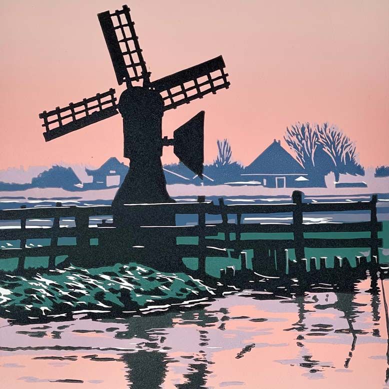 Geïnspireerd door verstilde landschappen, vertaald in diverse technieken als etsen, linoleumsnedes en olieverfschilderijen.