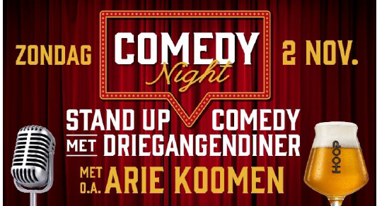 Een avond vol humor, gezelligheid en ambachtelijk bier, met o.a. Arie Koomen. Combineer de show met een smakelijk 3-gangen diner en sluit je week af met een brede lach.