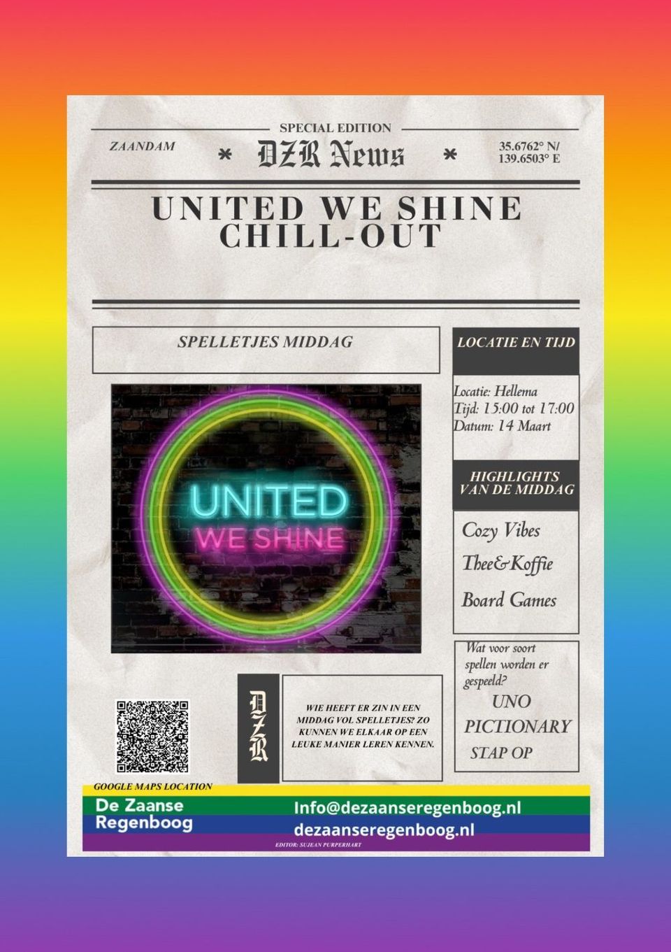 United we shine is een groep die door 3 Zaanse queer twintigers opgezet is. Wij organiseren in een veilige omgeving 1x per maand gezellige en laagdrempelige activiteiten zoals een spelletjesmiddag.