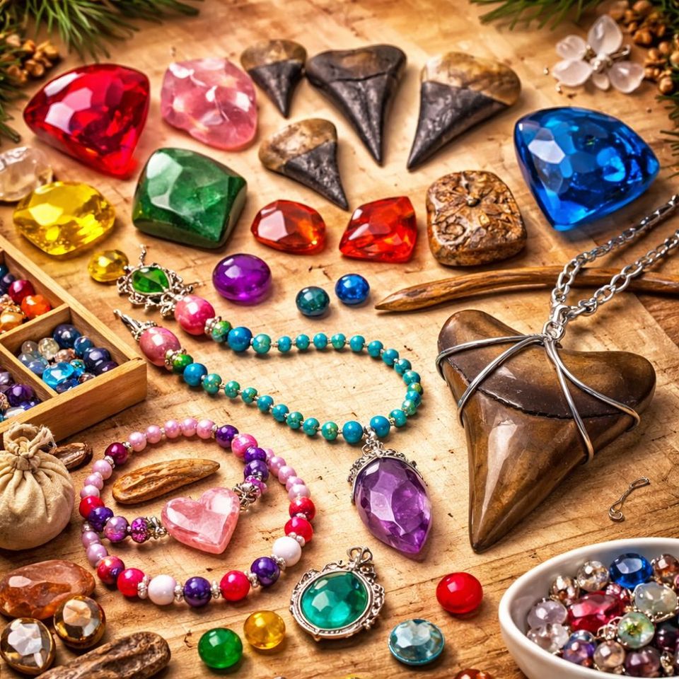 Er is een ruime selectie van echte edelstenen die gebruikt kunnen worden. Daarnaast zijn er mooie haaientanden en andere fossielen aanwezig, die je kunt verwerken tot een unieke hanger.