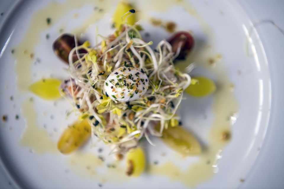 Nú staat onder andere op de kaart: een Zaanse huzarensalade met pekelvlees van de bio-koeien die in de achtertuin van Jongwijs lopen, met gepocheerde Westzaanse kwarteleitjes en mayonaise van Zaanse pompoensambal.