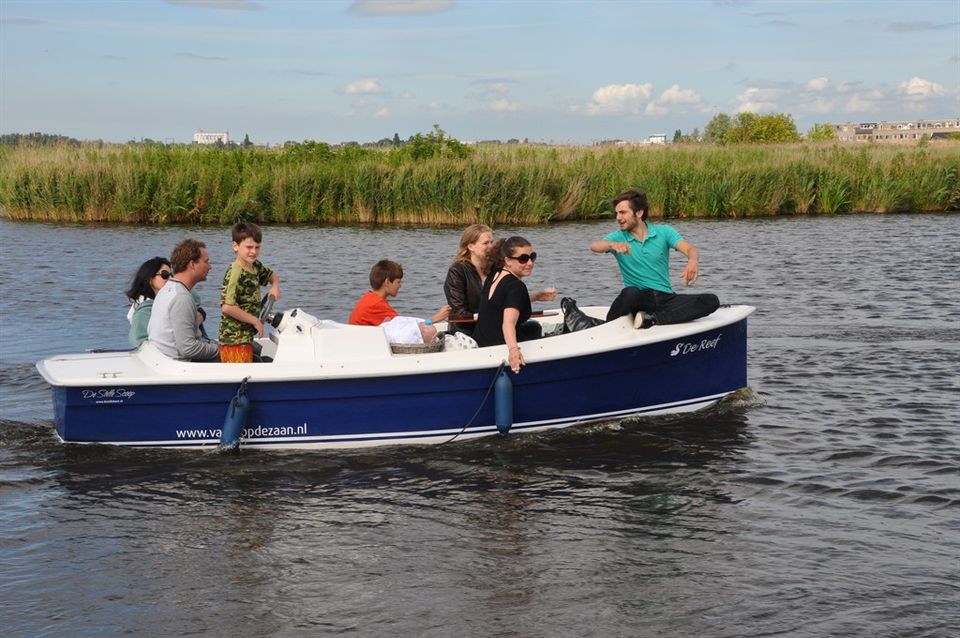 Varen in een fluisterstille elektrische sloep. Startpunt vanaf Rederij Varen op de Zaan, Kalverringdijk 25 in Zaandam.